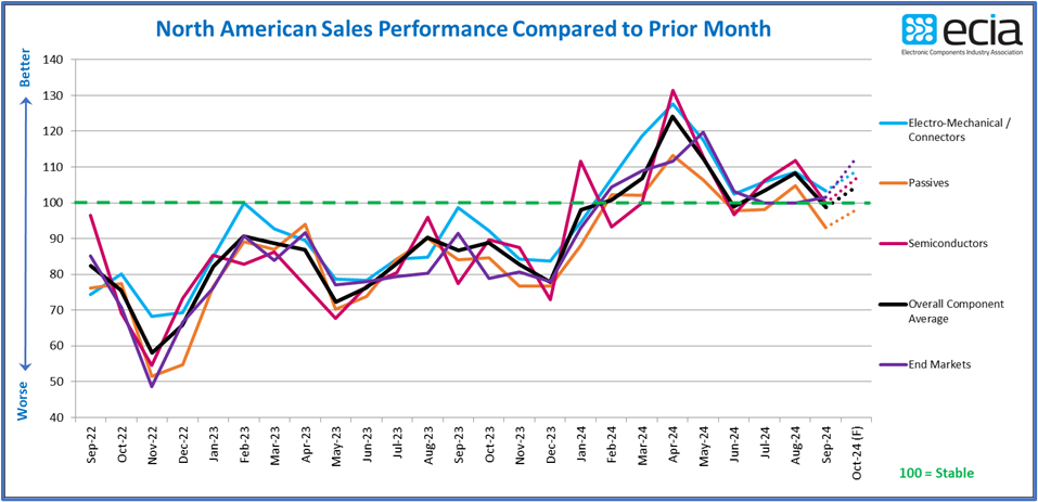 CONTACT: Jennifer Read October 7, 2024 FOR IMMEDIATE RELEASE Short-Lived Positive Sales Sentiment for Electronic Components Clipped by September Survey Results Atlanta — The overall positive market sentiment expressed by participants in the electronic components supply chain only lasted two months before the overall average fell below 100 in the September ECST survey. The overall index fell to 98.8, a drop of nearly 10 points. “While the September results are only slightly below the threshold of 100, the main message is that the momentum that appeared to be building has been lost,” noted ECIA Chief Analyst Dale Ford. “The market is still struggling to gain its footing to support consistent month-to-month growth. The results of the Q3 2024 ECST survey give cause for optimism looking toward the end of the year as expectations for Q4 sales improvement over Q3 was very solid across product and market segments.”
