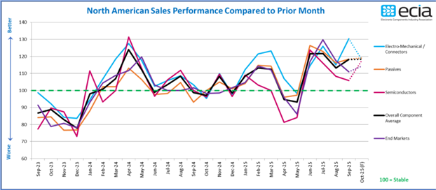 October 2, 2025 September Industry Pulse Sales Sentiment Results Convey Continuing Optimism Atlanta - The overall product sales sentiment index improved by 5 points between August and September, reaching 118.2 in the September Industry Pulse survey. “Once again, the actual survey results fell short of the exuberant forecast in the August survey,” commented ECIA’s Chief Analyst Dale Ford. “However, the improvement in the index in September and the fourth straight month of index scores solidly above the threshold of 100 is highly encouraging.” The index forecast for all three component categories converges around 118.3 in the October outlook. Only 1.5 points separate the Passive index forecast at 119.1 on the high end and Semiconductors at 117.6 on the low side. “Achieving this forecast would be a great start to the fourth quarter sales environment,” Ford concluded.